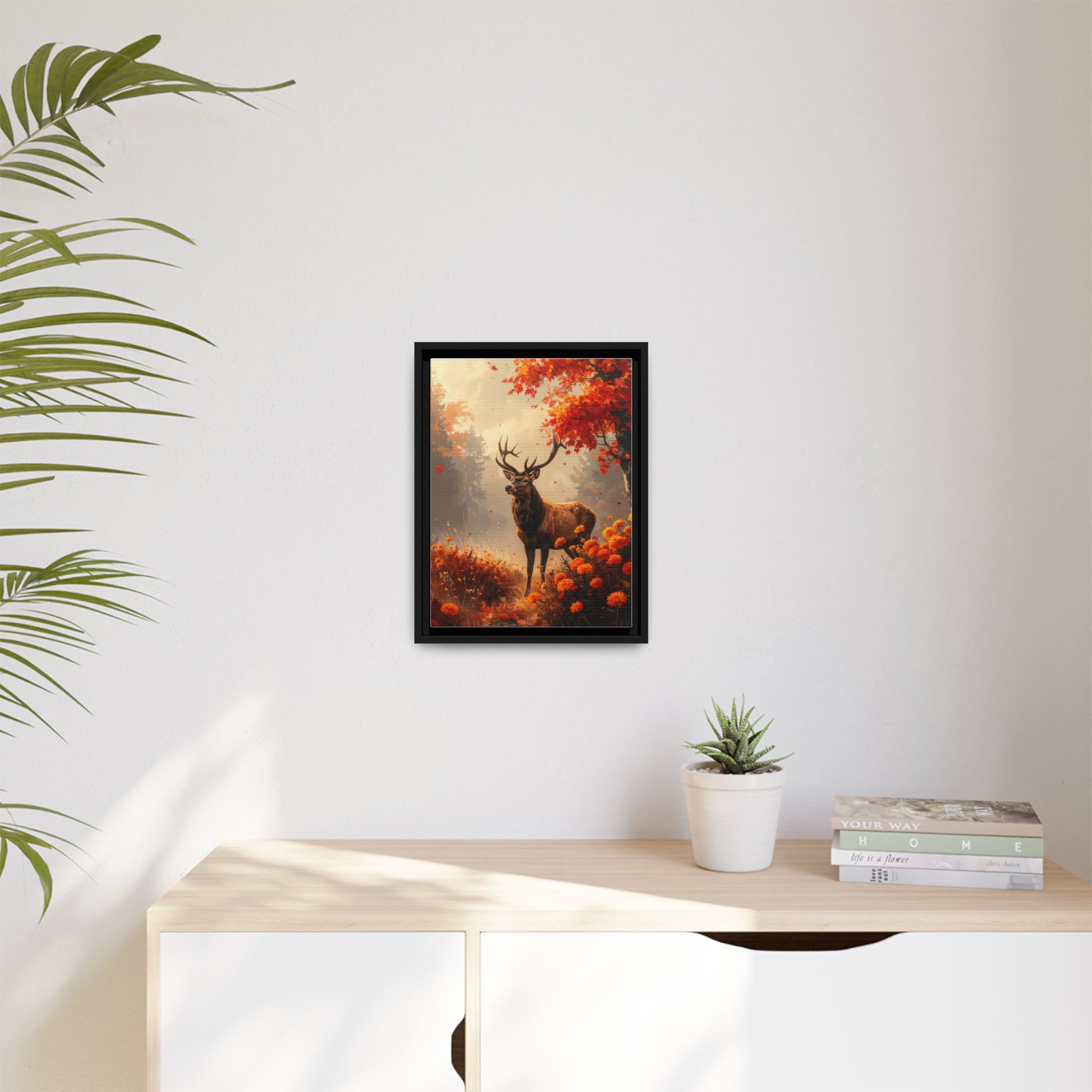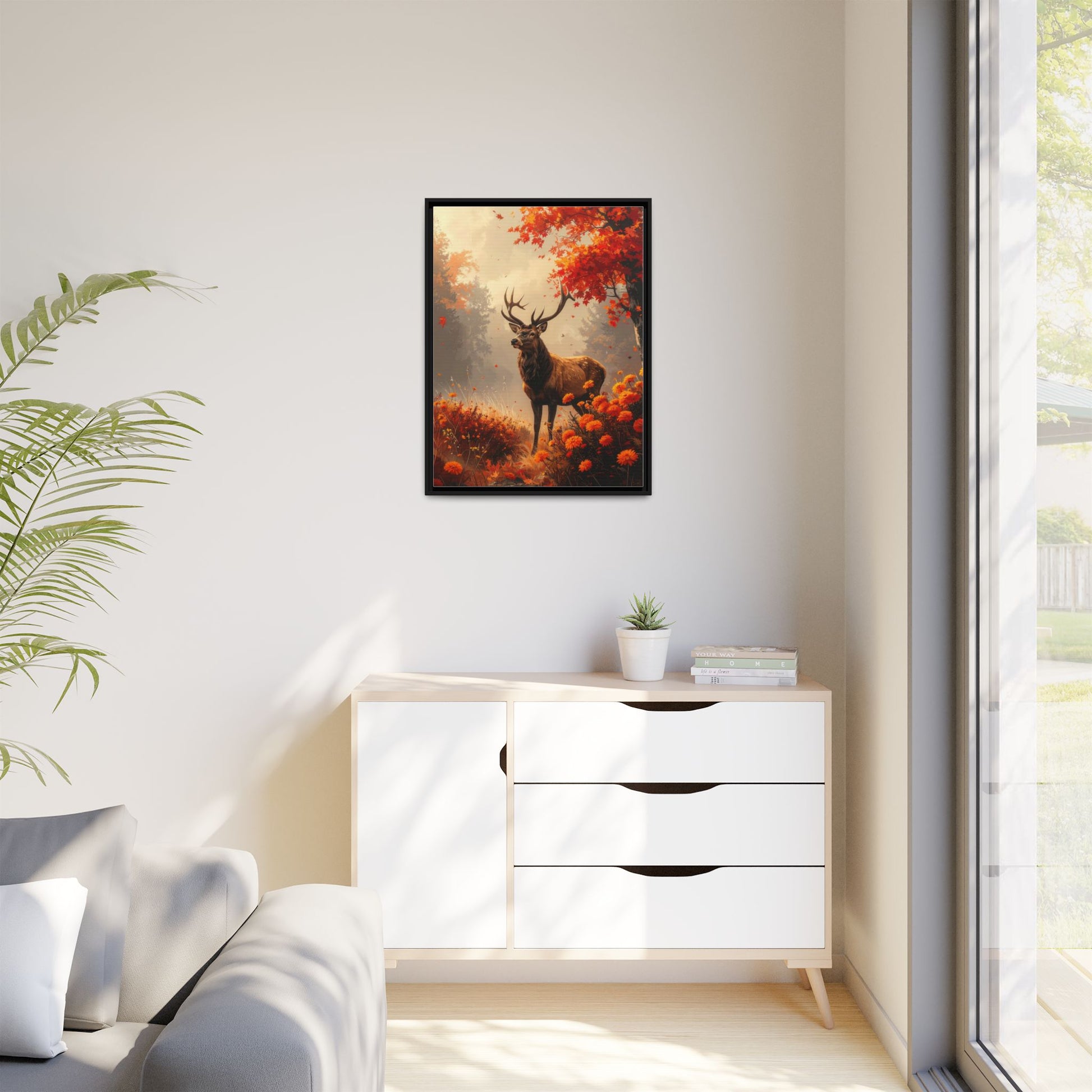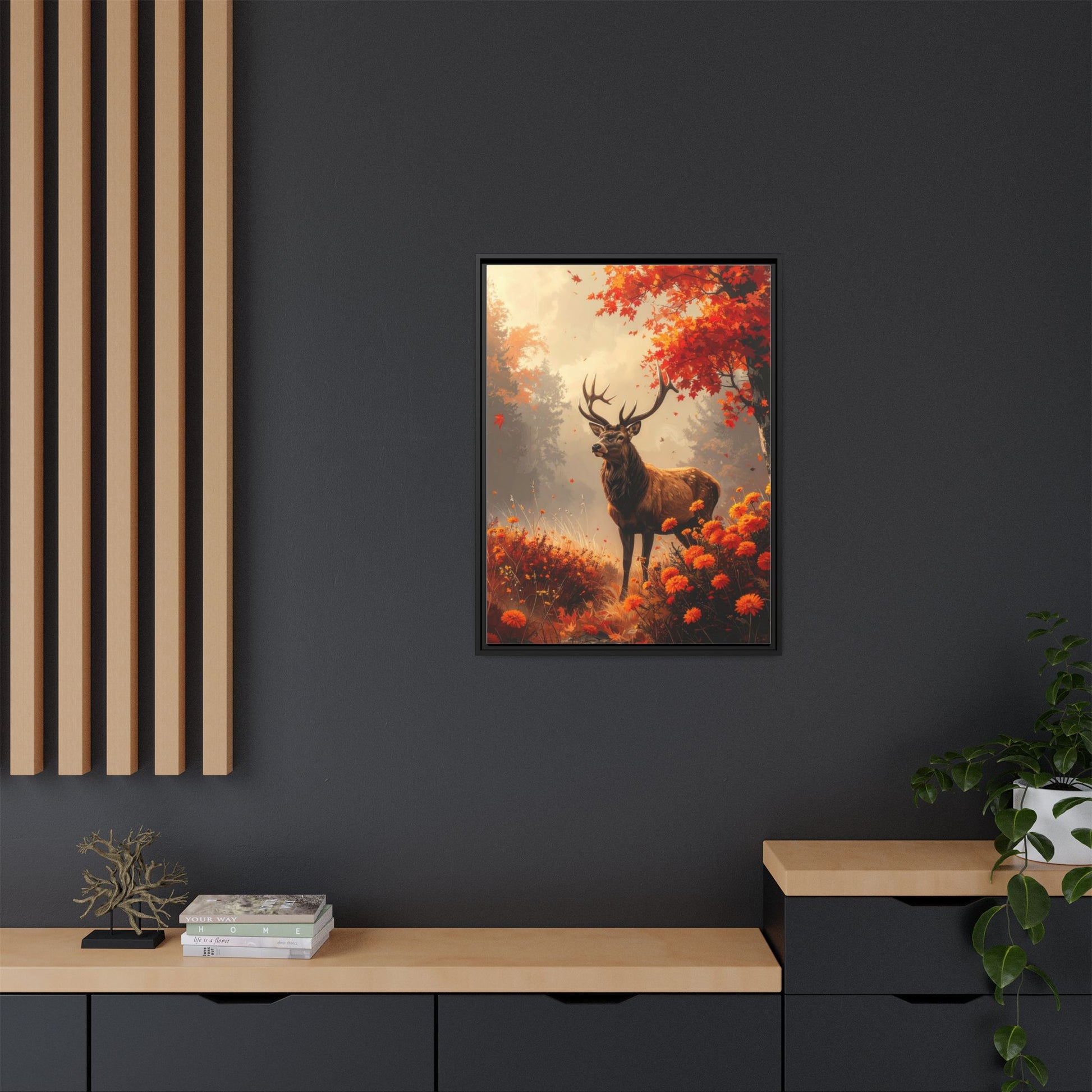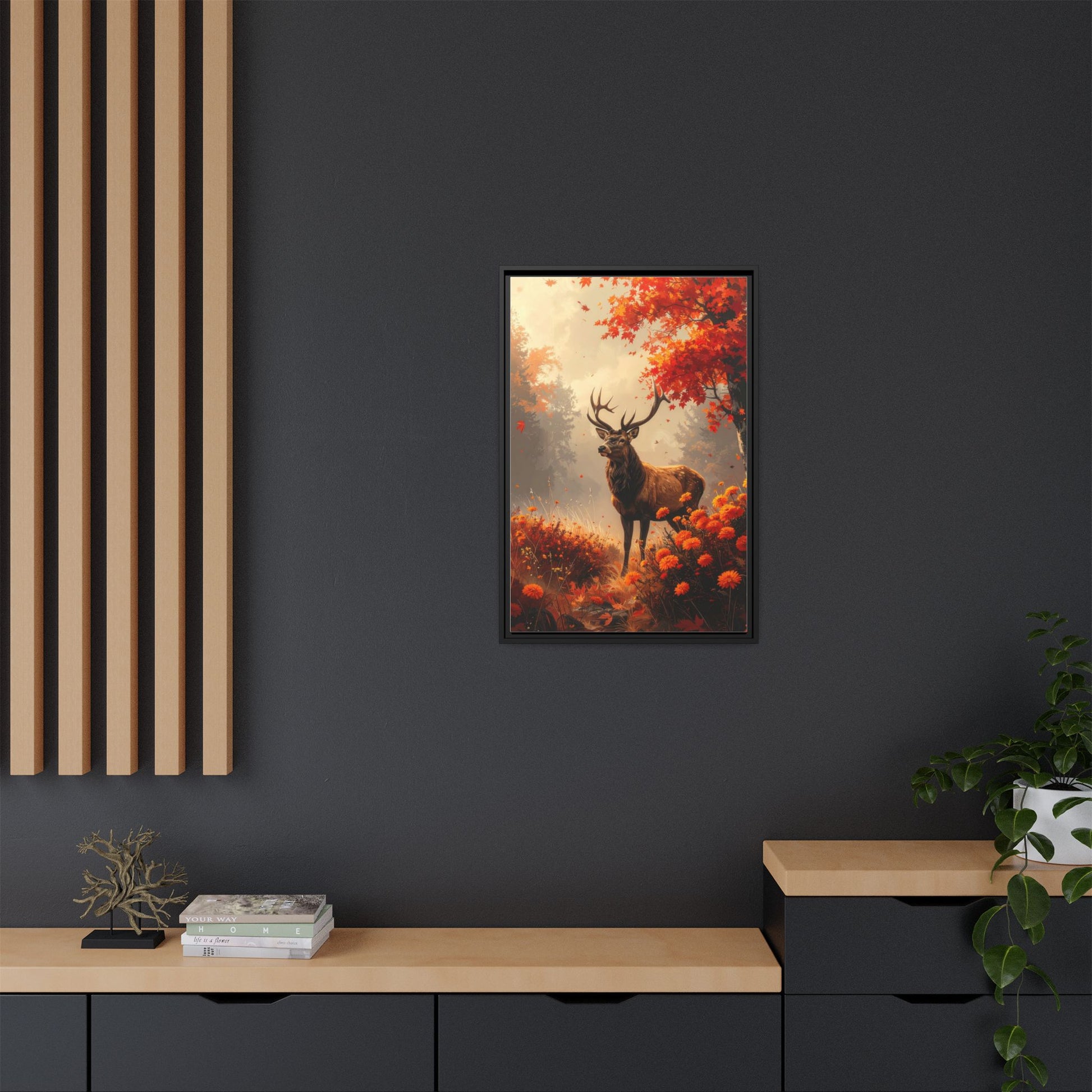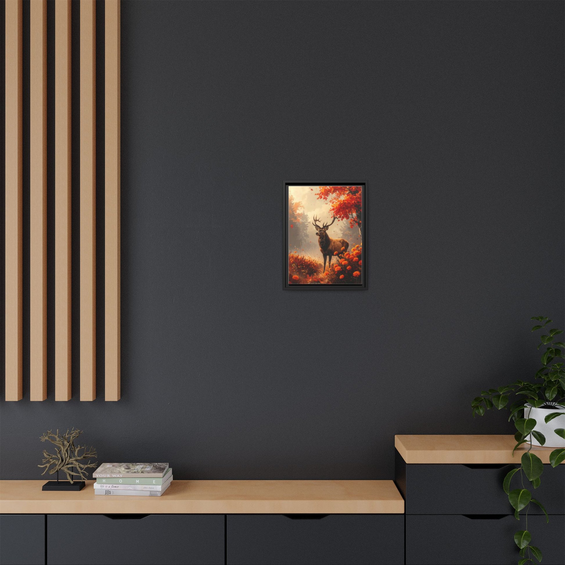 A beautiful Matte Canvas featuring a Reindeer looking off into the distance in an open forest surrounded by autumn leaves and flowers. Perfect for nature lovers and those who enjoy serene and peaceful artwork. Ideal for decorating homes during the fall season or to add a touch of nature to any room.
