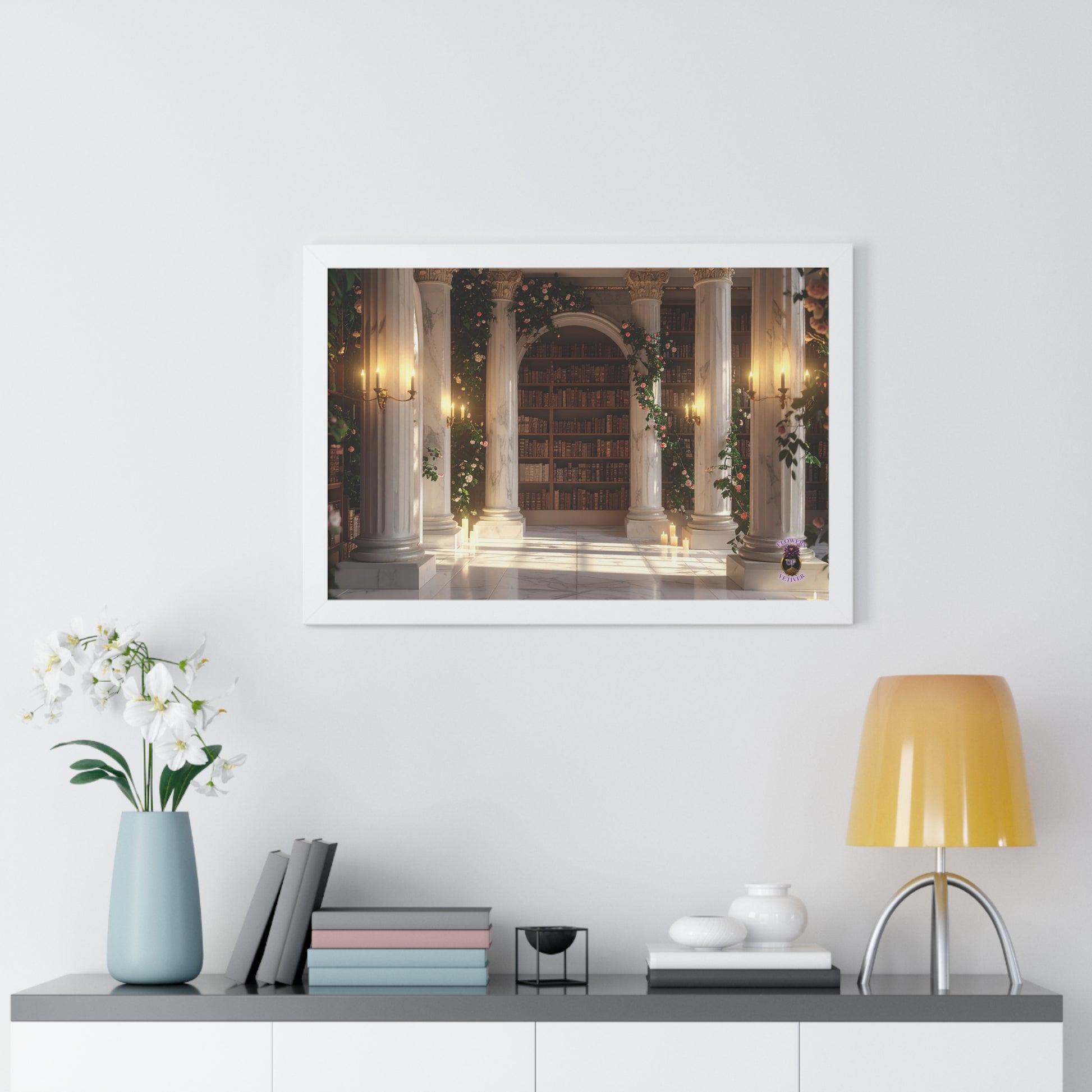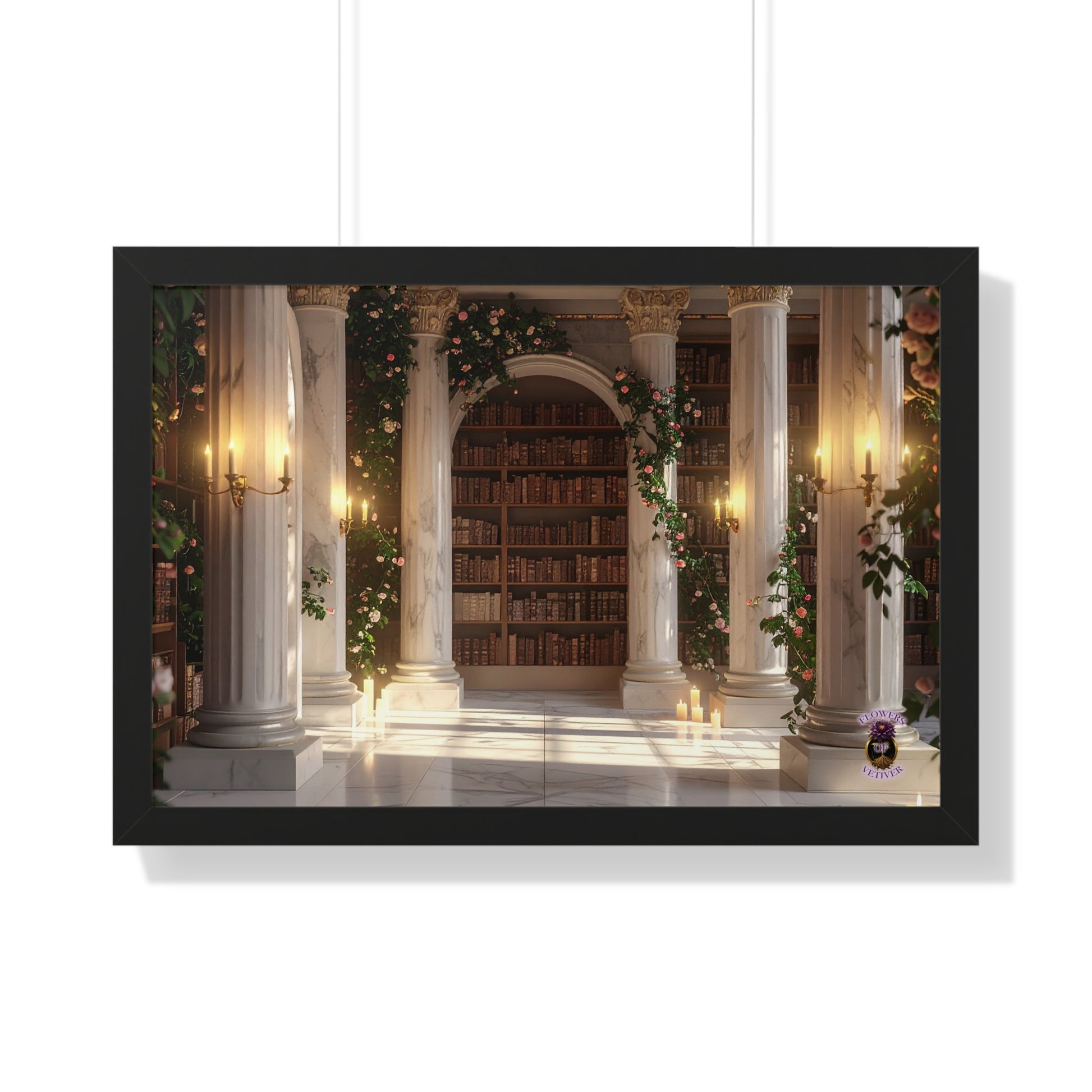 Lose yourself in the quiet magic of “The Enchanted Library.” This artwork captures a grand Renaissance library with towering marble columns, glowing candlelight, and delicate vines of jasmine and roses climbing gracefully along the walls. The warm, romantic atmosphere invites you into a world of knowledge, beauty, and timeless charm.